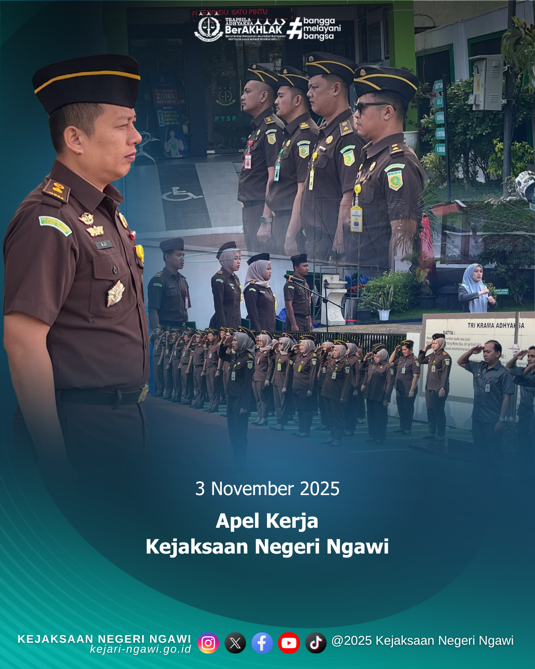 Bertempat di halaman Kantor Kejaksaan Negeri Ngawi, Kepala Seksi PAPBB Kejaksaan Negeri Ngawi, Bapak Kurnia Aji Nugroho, S.H., M.H., bertindak sebagai penerima apel yang diikuti oleh seluruh pegawai dan PPNPN Kejaksaan Negeri Ngawi.