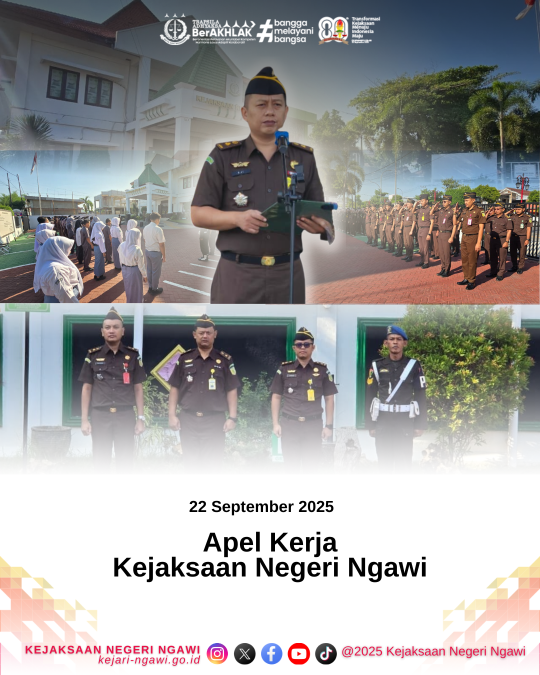 Bertempat di halaman Kantor Kejaksaan Negeri Ngawi, Kepala Seksi PAPBB Kejaksaan Negeri Ngawi, Bapak Kurnia Aji Nugroho, S.H., M.H., bertindak sebagai penerima apel yang diikuti oleh seluruh pegawai dan PPNPN Kejaksaan Negeri Ngawi.