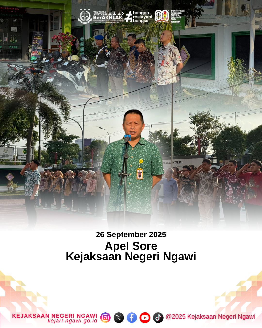 Kepala Seksi PAPBB Kejaksaan Negeri Ngawi, Bapak Kurnia Aji Nugroho, S.H., M.H., bertindak sebagai Penerima Apel Kerja Sore Kejaksaan Negeri Ngawi yang diikuti oleh seluruh Pegawai dan PPNPN Kejaksaan Negeri Ngawi.