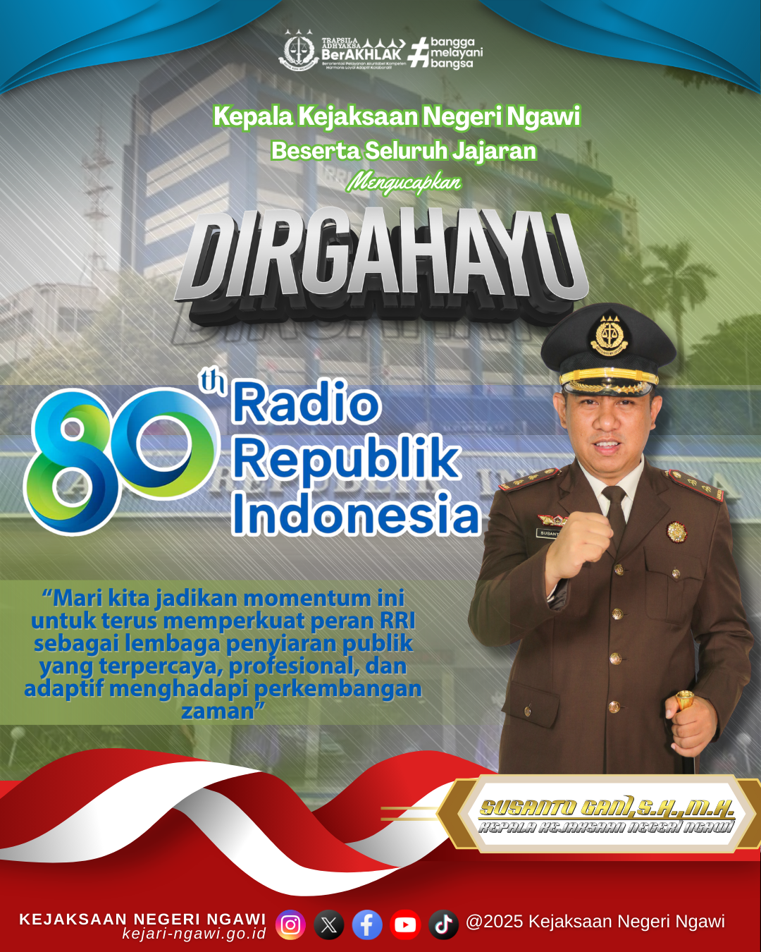 Kepala Kejaksaan Negeri Ngawi, Bapak Susanto Gani, S.H., M.H., beserta jajaran mengucapkan “Dirgahayu Radio Republik Indonesia ke-80”.