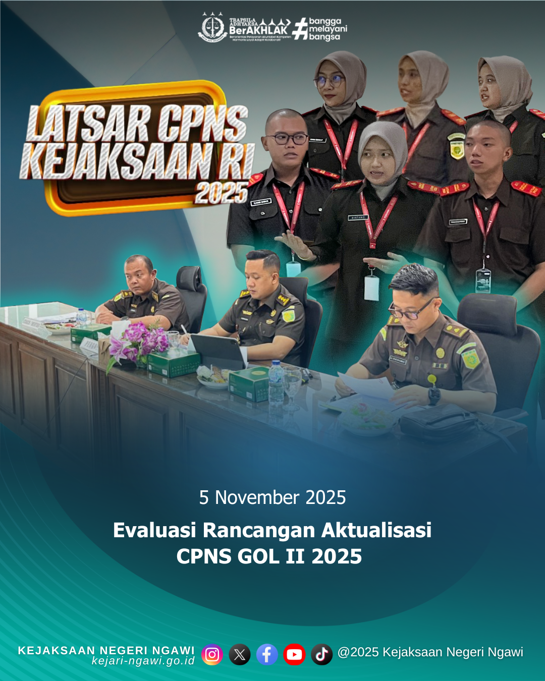 Kejaksaan Negeri Ngawi melaksanakan kegiatan Evaluasi Rancangan Aktualisasi bagi peserta Pelatihan Dasar Calon Pegawai Negeri Sipil (CPNS) Golongan II Tahun 2025. Kegiatan ini dihadiri oleh Koordinator dari Kejaksaan Tinggi Jawa Timur, Bapak Farhan Junaedi, S.H., M.H., selaku Penguji, serta Kepala Seksi Tindak Pidana Khusus, Bapak Eriksa Ricardo, S.H., M.H., dan Kepala Sub Bagian Pembinaan, Bapak Farid Achmad, selaku Coach/Mentor.