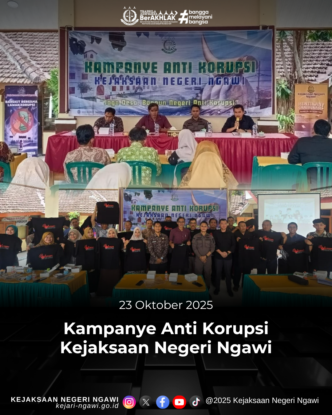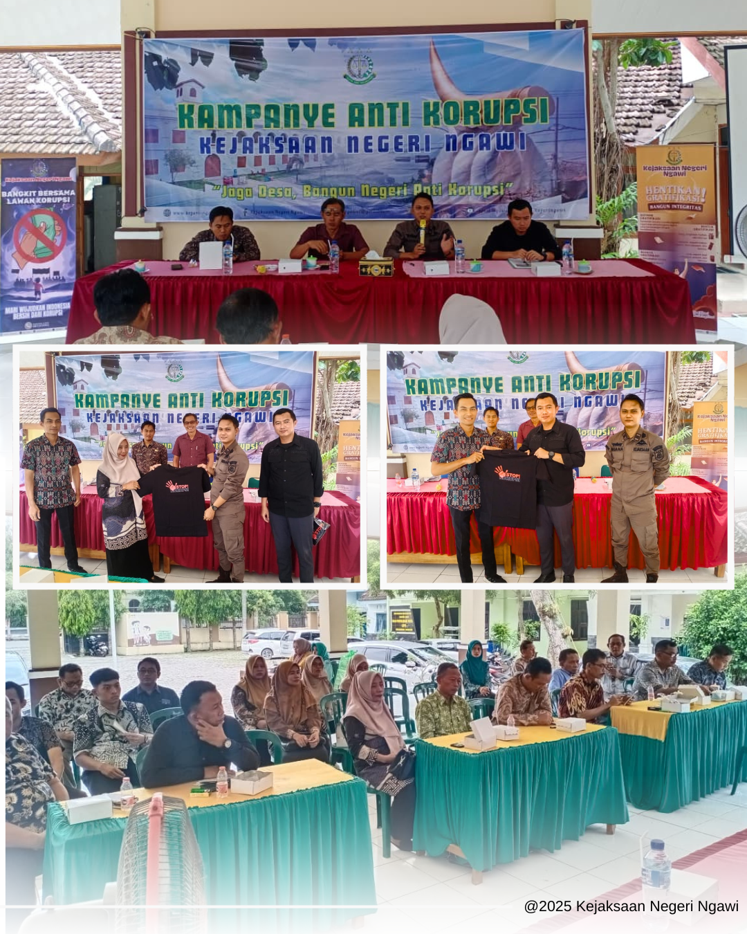 Kejaksaan Negeri Ngawi yang diwakili oleh Kepala Sub Seksi Intelijen, Bapak Bayu Tri Buana, S.H., dan Bapak Dwi Suryo Wibowo, S.H., melaksanakan kegiatan Kampanye Anti Korupsi Tahun 2025 yang bertempat di Aula Kecamatan Bringin, Kabupaten Ngawi, dengan penanggung jawab kegiatan Bapak Danang Yudha Prawira, S.H., M.H., selaku Kepala Seksi bidang Intelijen Kejaksaan Negeri Ngawi.