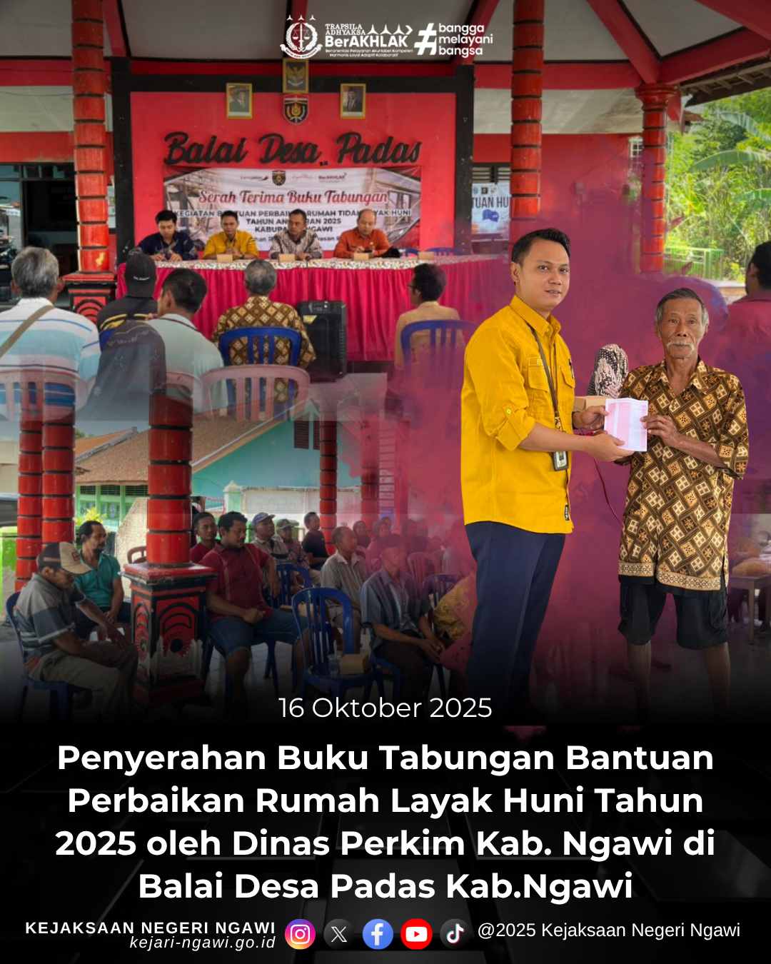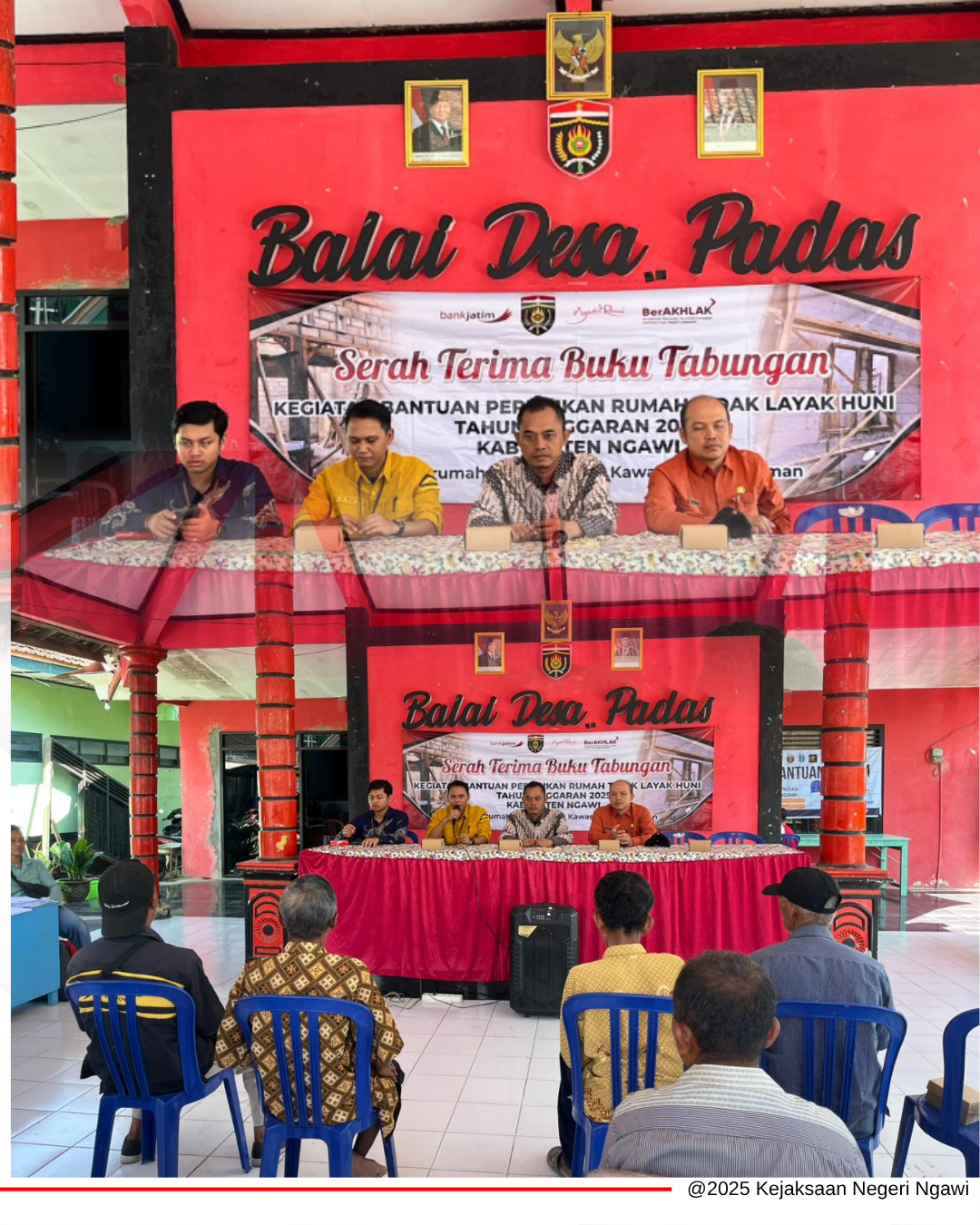 Kasubsi Intelijen, Bapak Bayu Tri Buana, S.H. bersama Staff Intelijen Kejaksaan Negeri Ngawi menghadiri kegiatan penyerahan buku tabungan bantuan perbaikan rumah layak huni tahun 2025 yang diselenggarakan oleh Dinas Perumahan dan Kawasan Permukiman (Perkim) Kabupaten Ngawi, bertempat di Balai Desa Padas, Kecamatan Padas, Kabupaten Ngawi.
