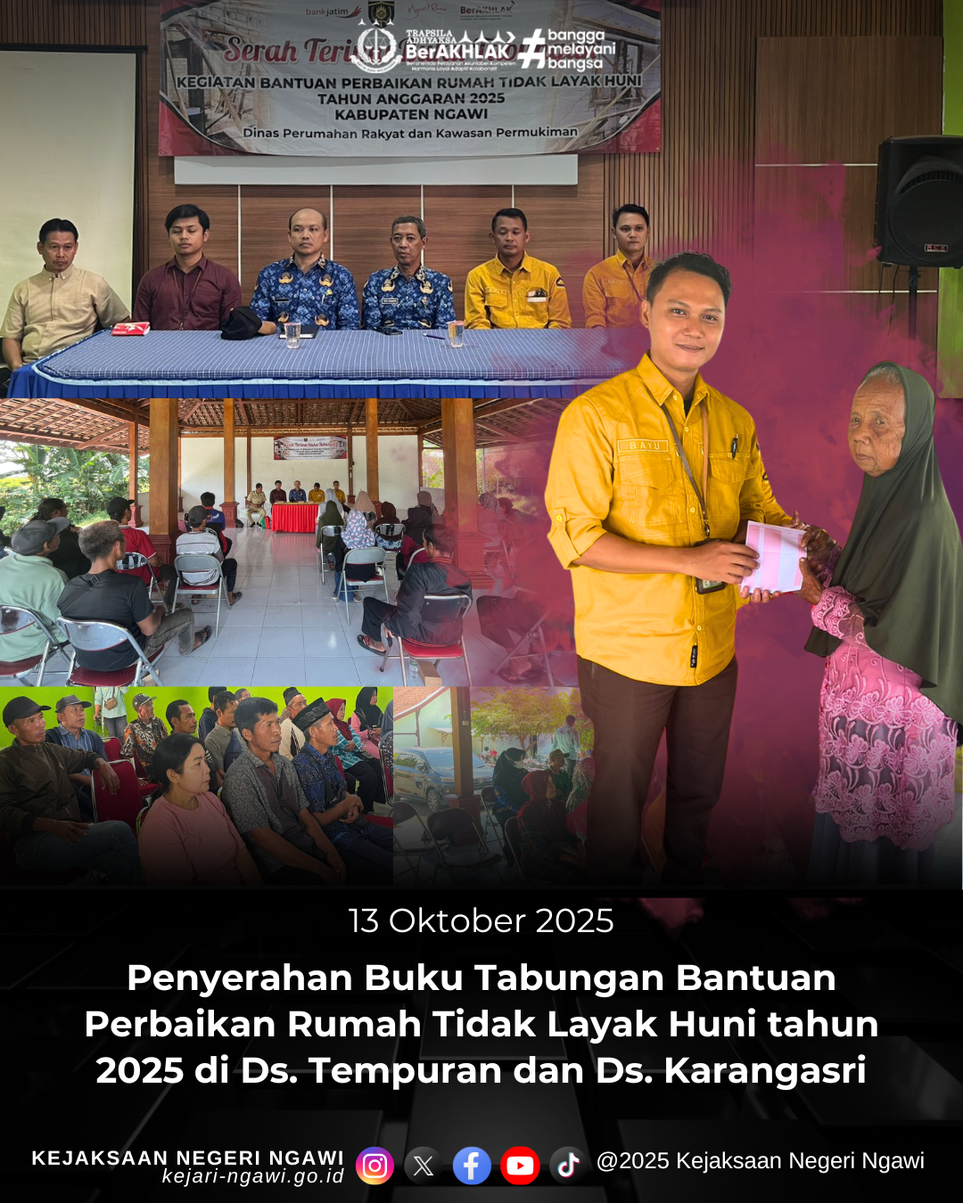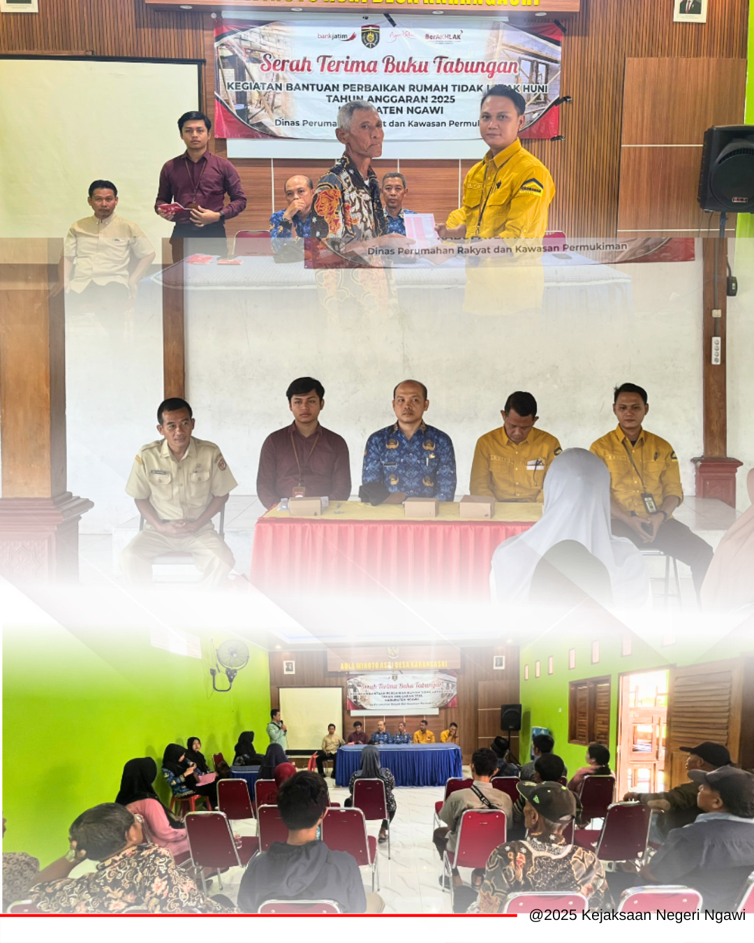 Bidang Intelijen Kejaksaan Negeri Ngawi melalui Kasubsi II Intelijen, Bapak Bayu Tri Buana, S.H., menghadiri kegiatan Penyerahan Buku Tabungan Bantuan Perbaikan Rumah Tidak Layak Huni (RTLH) Tahun 2025 di Desa Tempuran dan Desa Karangasri, Kecamatan Paron, Kabupaten Ngawi. Kegiatan ini dihadiri oleh perwakilan Dinas Perkim, Polres Ngawi, Bappeda, Inspektorat, Bagian Hukum Setda, Bank Jatim, serta para penerima bantuan.