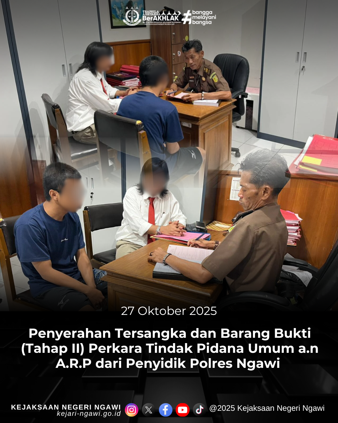 Kejaksaan Negeri Ngawi melaksanakan kegiatan Penyerahan Tanggung Jawab Tersangka dan Barang Bukti (Tahap II) perkara tindak pidana umum dengan tersangka A.R.P. yang diduga melanggar Pasal 338 KUHP, dari Penyidik Polres Ngawi kepada Penuntut Umum.