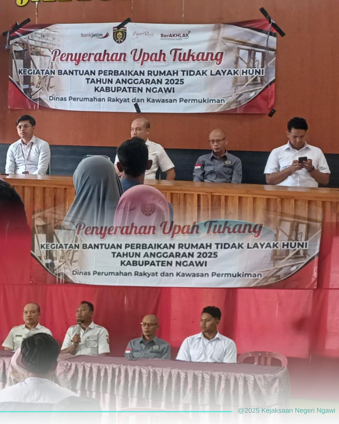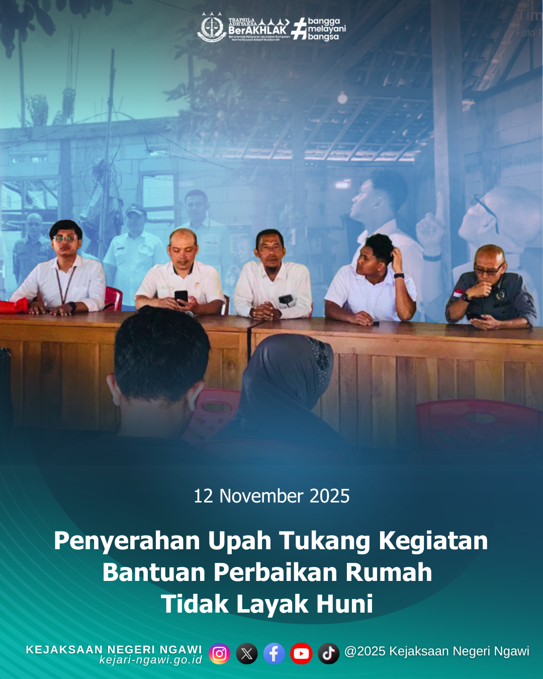 Kejaksaan Negeri Ngawi melalui Bidang Intelijen menghadiri kegiatan Penyerahan Upah Tukang Bantuan Perbaikan Rumah Tidak Layak Huni (RTLH) Tahun 2025 yang diselenggarakan oleh Dinas Perumahan Rakyat dan Kawasan Permukiman Kabupaten Ngawi di Balai Desa Jatigembol, Kecamatan Kedunggalar, Balai Desa Sambirejo, Kecamatan Mantingan dan Balai Desa Walikukun, Kecamatan Widodaren, Kabupaten Ngawi.