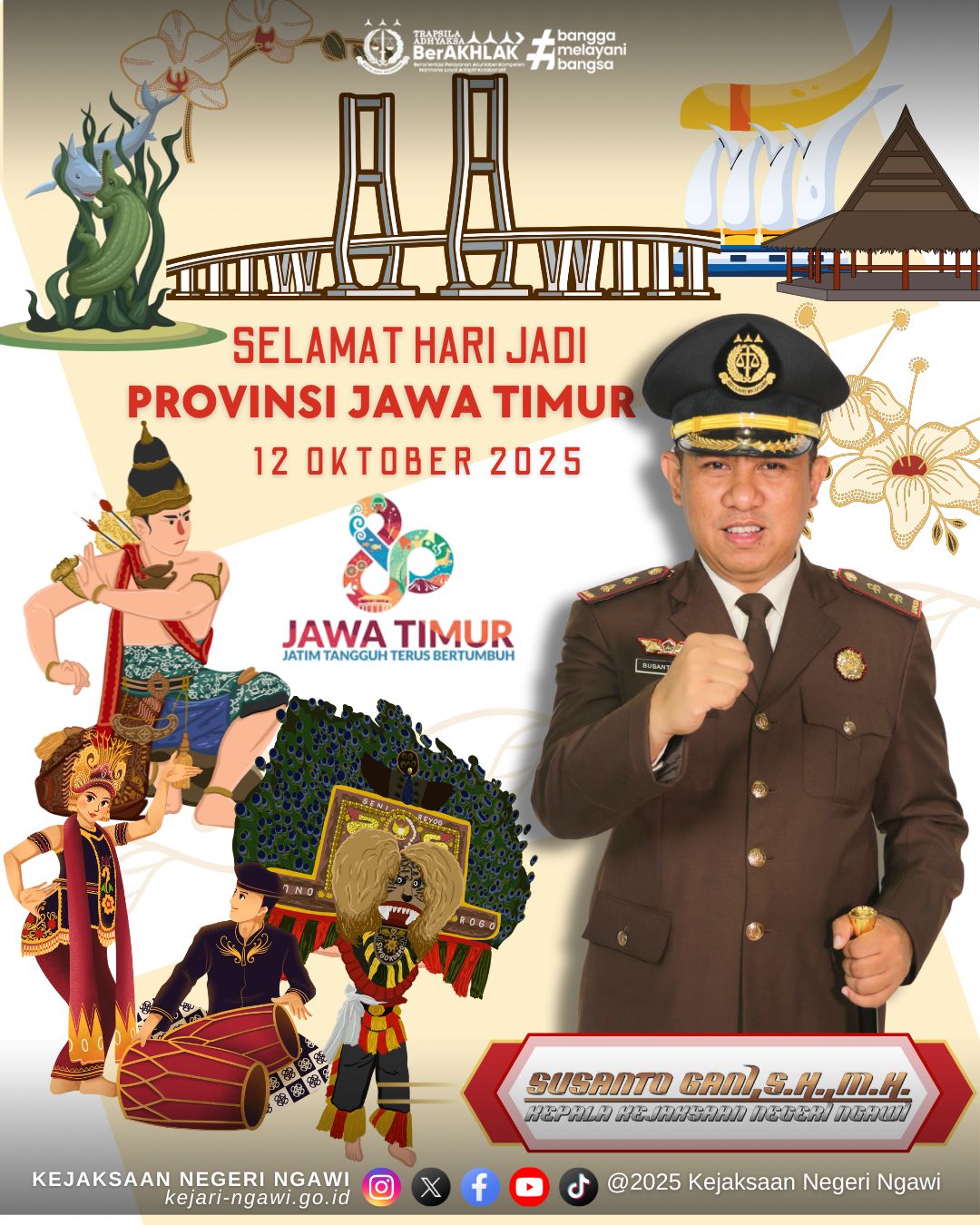 Kepala Kejaksaan Negeri Ngawi, Bapak Susanto Gani, S.H., M.H., beserta jajaran mengucapkan “Selamat Hari Jadi Provinsi Jawa Timur ke-80”.