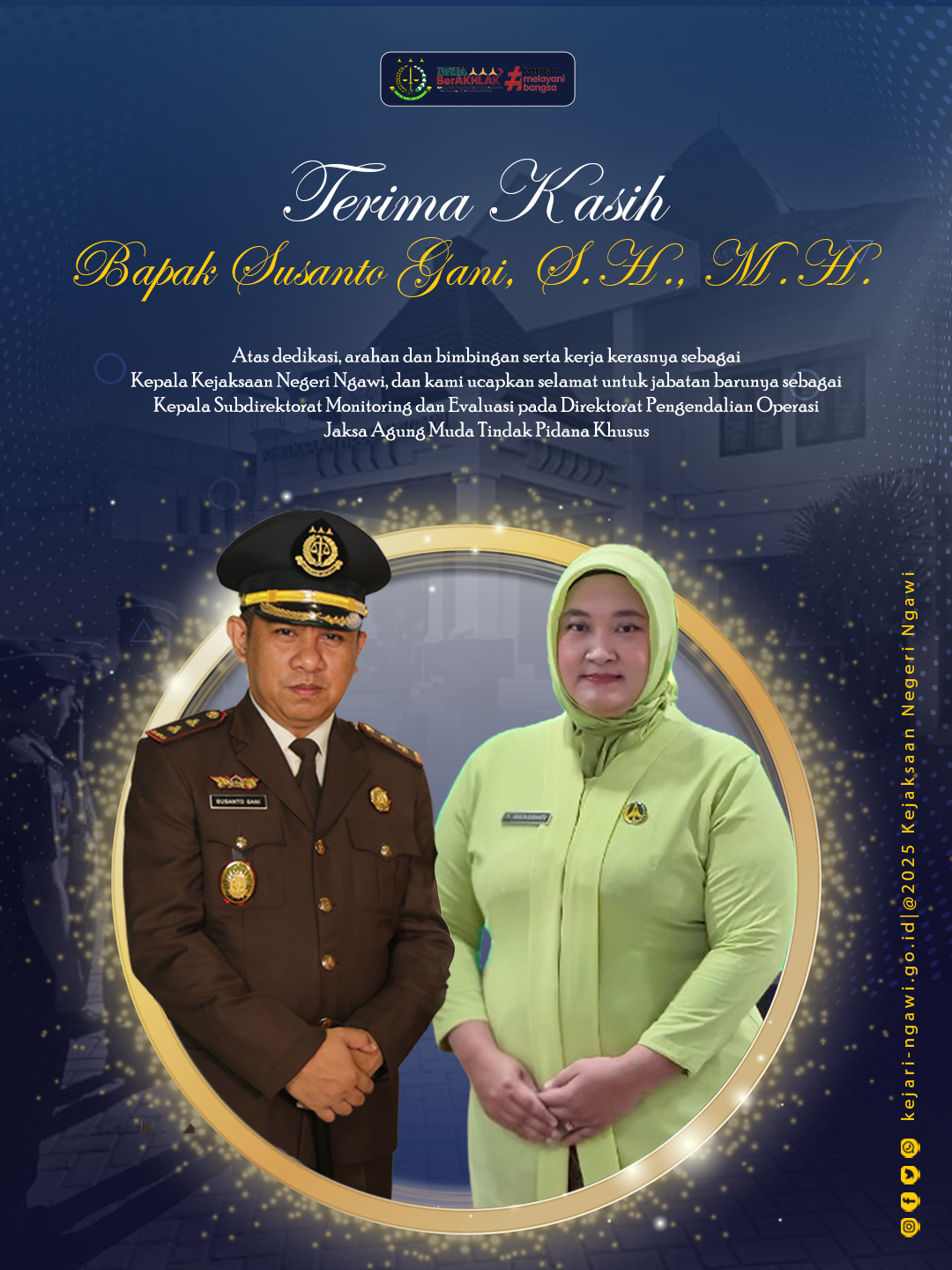 atas dedikasi, pengabdian, serta kepemimpinan yang penuh keteladanan selama menjabat sebagai Kepala Kejaksaan Negeri Ngawi.