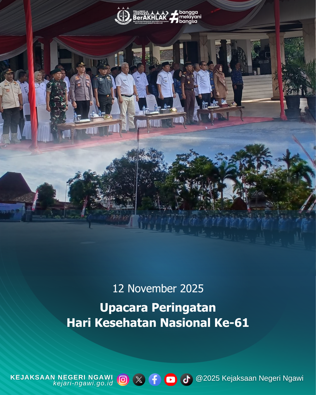Kepala Kejaksaan Negeri Ngawi, Bapak Adyantana Meru Herlambang, S.H., M.H., menghadiri kegiatan Upacara Peringatan Hari Kesehatan Nasional ke-61 Tahun 2025 yang dilaksanakan di Halaman Pendopo Wedya Graha Kabupaten Ngawi.