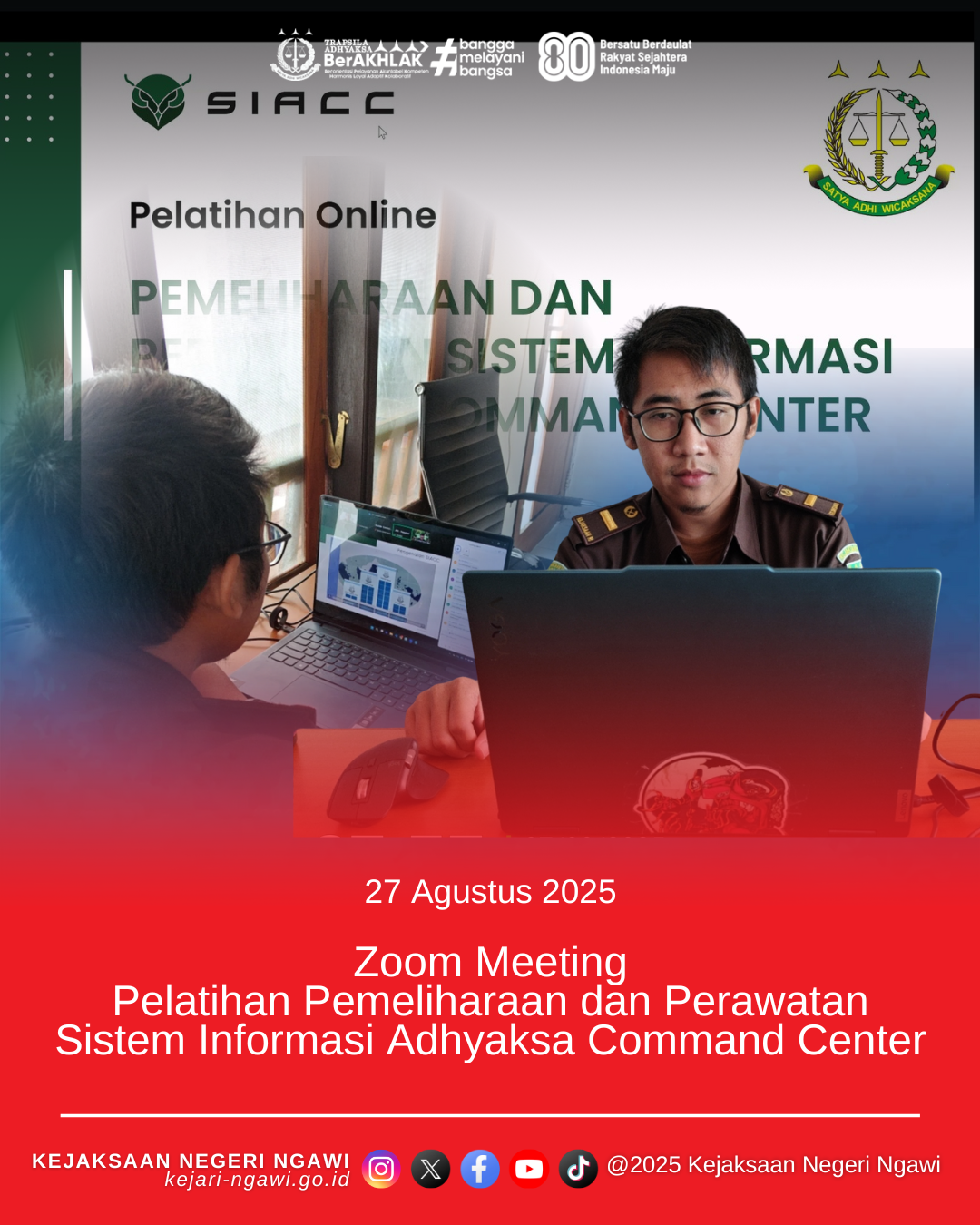 Kejaksaan Negeri Ngawi Melalui Bidang Intelijen mengikuti Pelatihan Online terkait Pemeliharaan Dan Perawatan Sistem Informasi Adhyaksa Command Center (SIACC) melalui aplikasi Zoom Meeting, yang dilaksanakan di Kantor Kejaksaan Negeri Ngawi.
