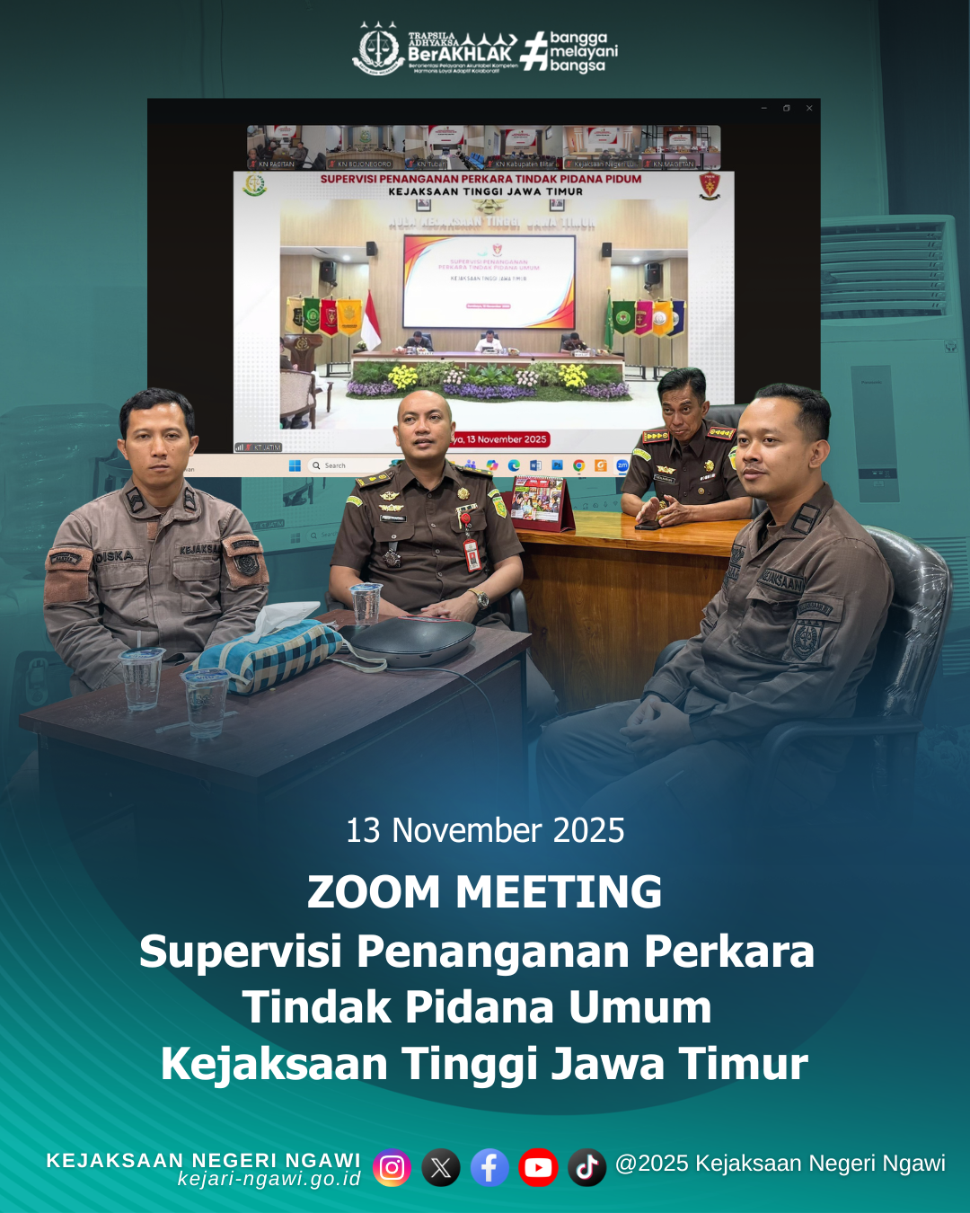 Kepala Kejaksaan Negeri Ngawi, Adyantana Meru Herlambang, S.H., M.H. beserta Kepala Seksi Tindak Pidana Umum, Jaksa dan staf bidang tindak pidana umum mengikuti Supervisi Penanganan Perkara Tindak Pidana Umum Kejaksaan Tinggi Jawa Timur secara virtual bertempat di ruang Vicon Kejaksaan Negeri Ngawi.